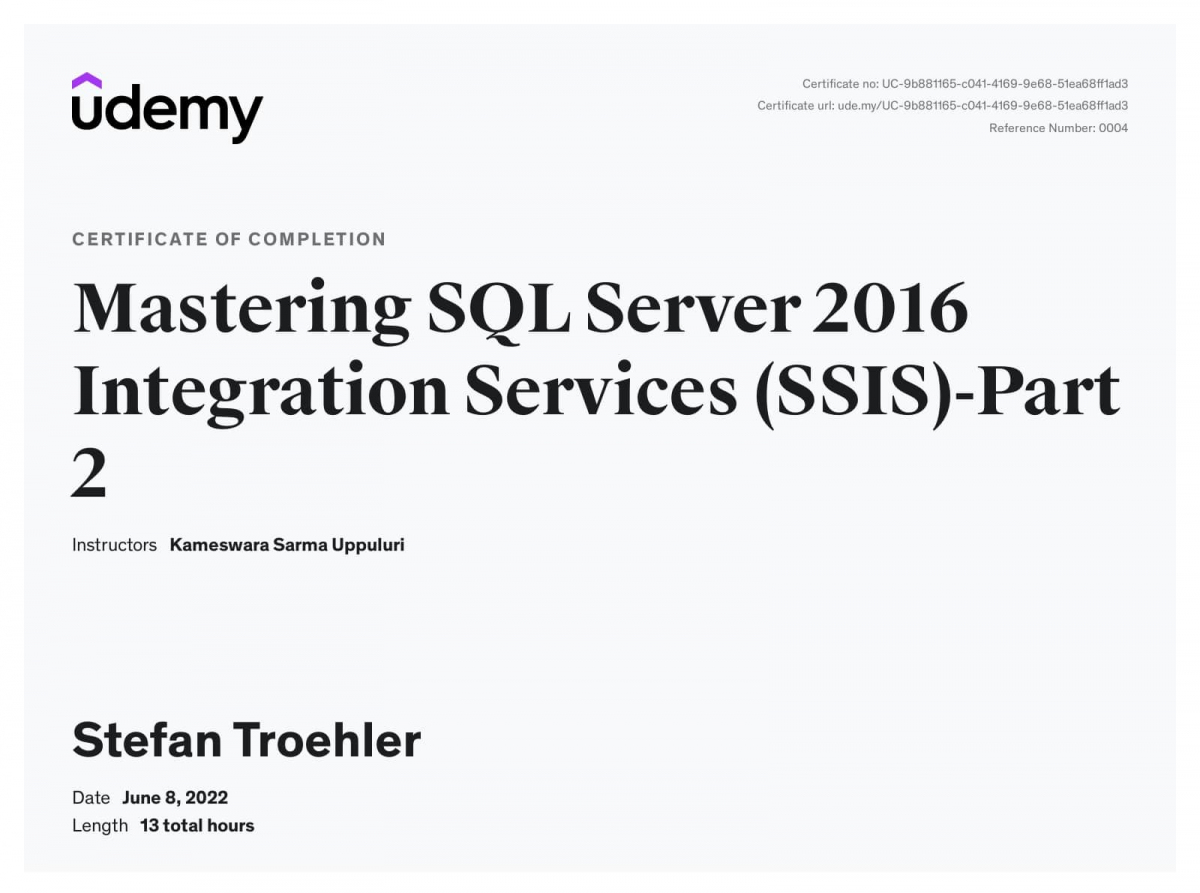 This certificate above verifies that Stefan Troehler successfully completed the course Mastering SQL Server 2016 Integration Services (SSIS)-Part 2 on 06/08/2022 as taught by Kameswara Sarma Uppuluri on Udemy. The certificate indicates the entire course was completed as validated by the student. The course duration represents the total video hours of the course at time of most recent completion.
